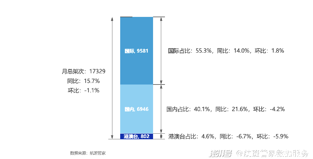 2024年4月份,民航货运航班17329架次,同比增长15.7%,环比下降1.1%。国内航班占比40.1%、国际航班占比55.3%、港澳台4.6%,货运市场仍以国际货运为主。