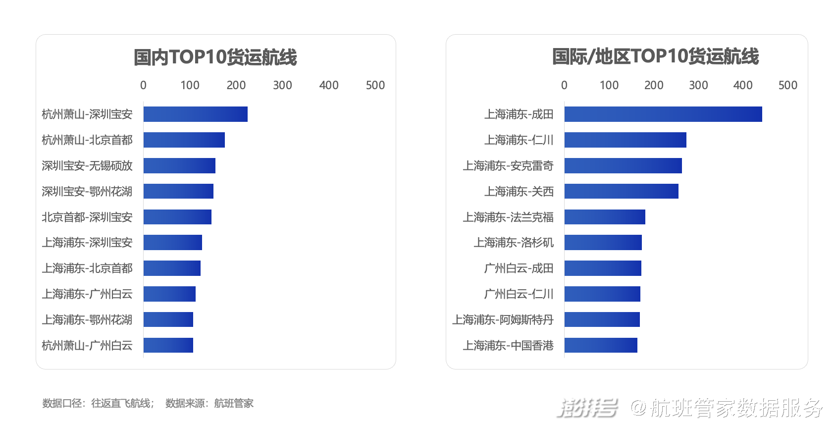 4、国内TOP航线多为深圳、杭州线,国际多为浦东相关线