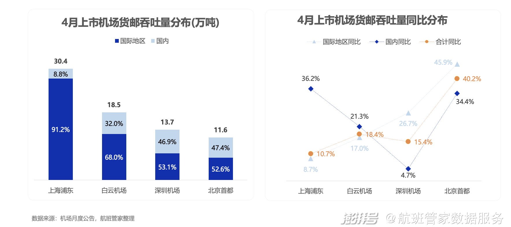 4月上市机场货邮吞吐量同比皆出现不同程度的增长,分别增长:浦东10.7%、白云18.4%、宝安15.4%、首都40.2%,浦东机场以国际/地区货运为主,货运量占比超9成。