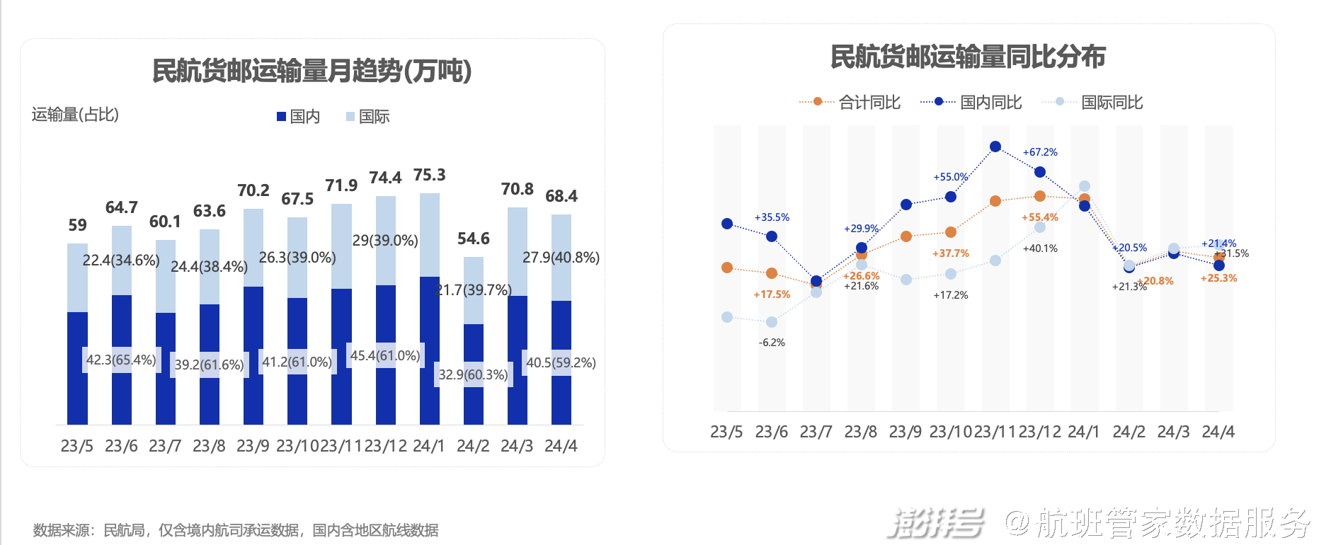 2024年4月份,我国民航货邮运输量68.4万吨(客机腹舱与货机总量,后同),同比增长25.3%,同比2019年增长12.5%;分航线类型来看,国内航线(含地区)货邮运输40.5万吨(占比59.2%),同比增长21.4%,国际航线货邮运输27.9万吨(占比40.8%),同比增长31.5%。